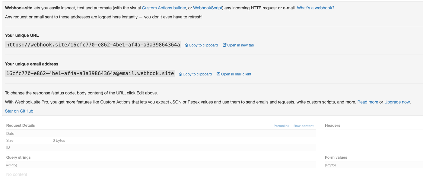 To illustrate the use of custom webhooks here, we will create a temporary webhook url over